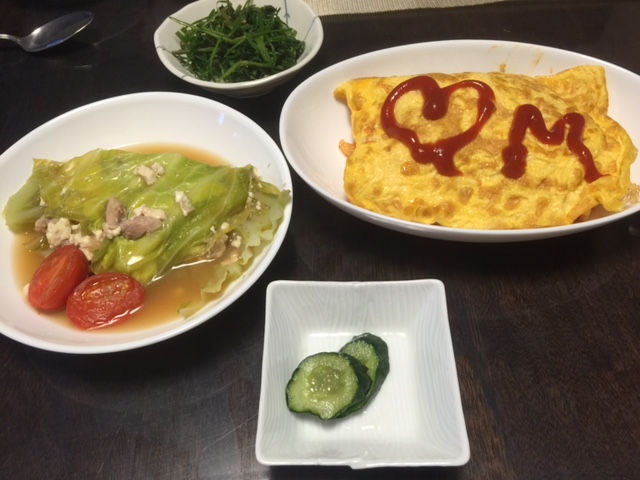 春キャベツと挽肉の重ね蒸し煮とチキンオムライス
