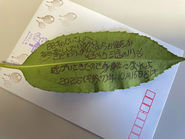 日本郵便による“タラヨウの葉に文字を書く”体験が開かれていた